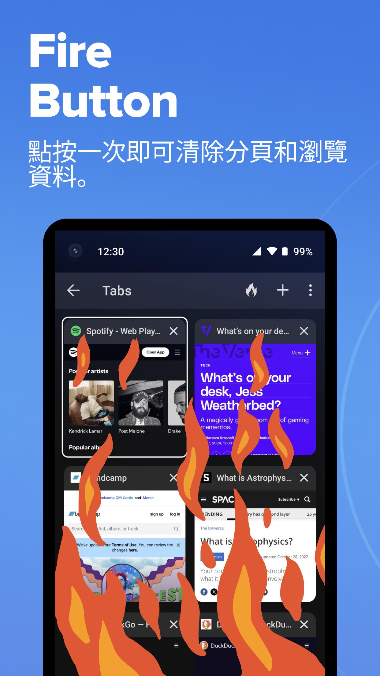 點擊 Fire Button,燒毀資料— 使用我們的 Fire Button 清除你的分頁和瀏覽資料。