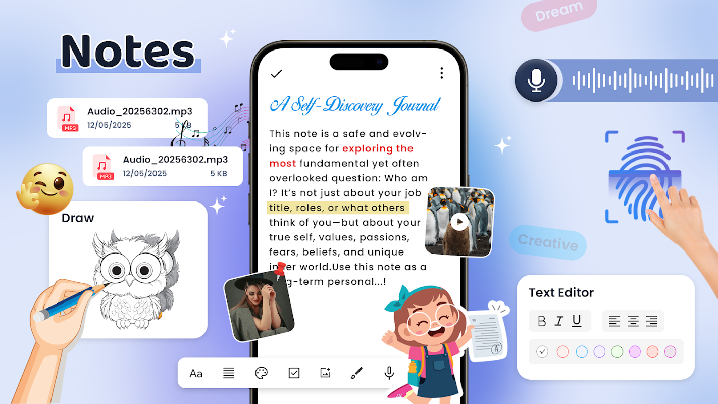 Notes:記事本和任務提醒是一款簡潔且強大的筆記應用,可用於快速記錄筆記、建立清單和管理任務。將您的筆記、提醒和日曆活動整合到一個地方。使用便利貼輕鬆訪問,不錯過任何任務。無論您是需要用於學習、工作還是日常生活的筆記本,這款筆記應用程式都能確保您的想法安全有序。簡潔易用的介面非常適合建立待辦事項清單、會議記錄和快速提醒。所有任務和筆記均已同步,隨時可用,助您高效工作。