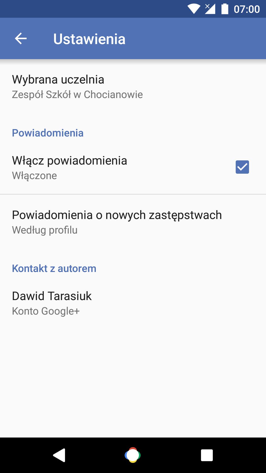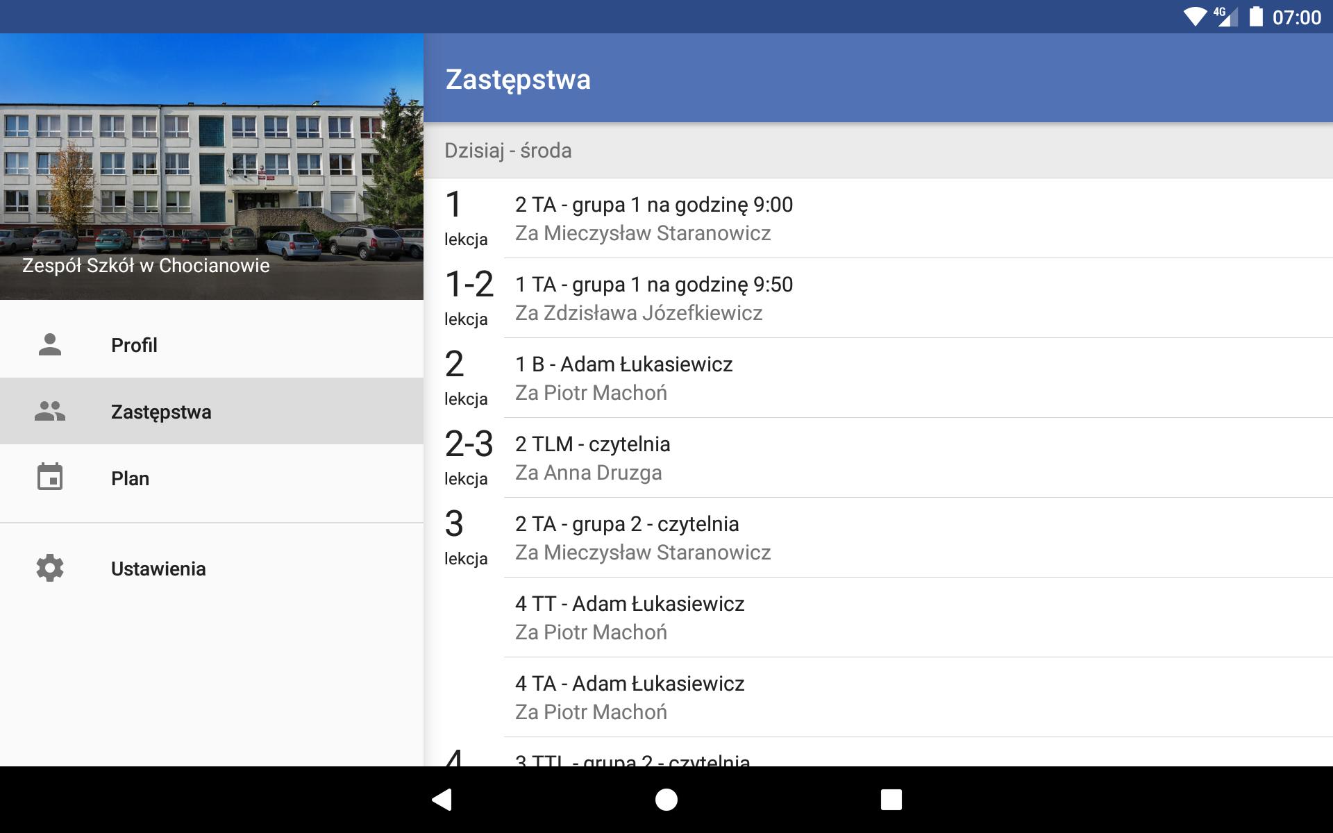 The application works only for the Team of Schools in Chocianów. For putting data on substitutions and timetable are responsible representatives of this educational institution.