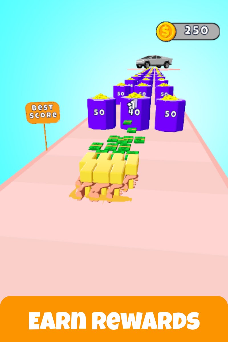 Each level is different and becomes more exciting as you progress. You will face new layouts, more money blocks to press, and higher value stacks to merge. The levels are short, simple, and fun to repeat. You can always try again to get a better reward.