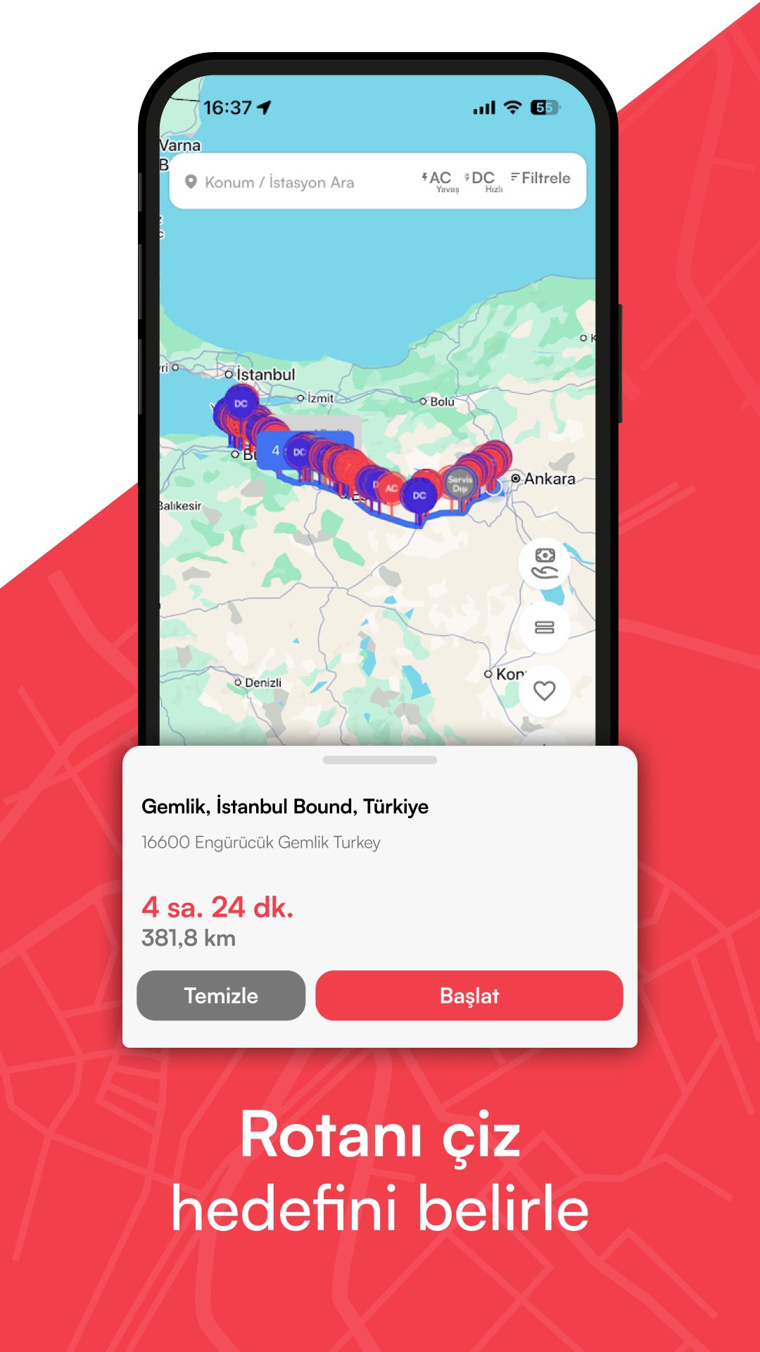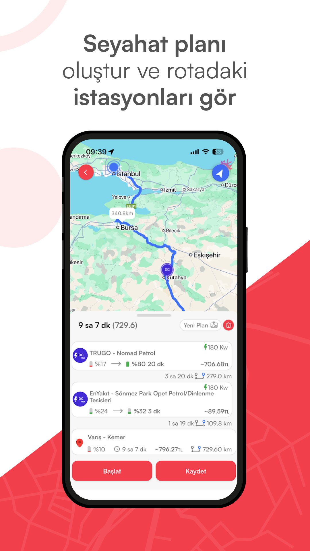 Elektrikli araç şarj istasyonlarını gör, şarj fiyatlarını öğren & rota oluştur.